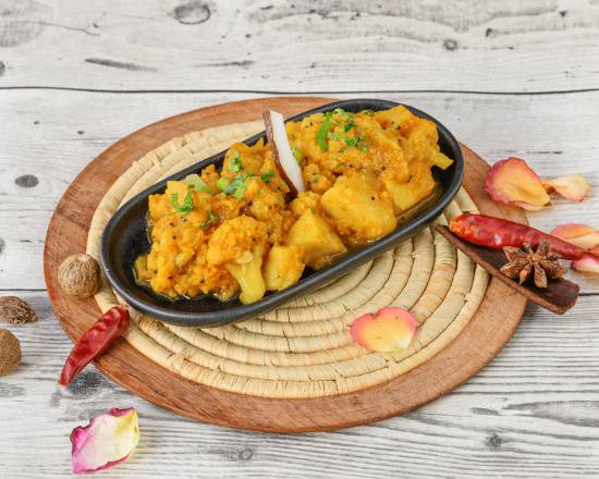 Aloo Gobi: Plat chaud Curry de pommes de terre et chou fleur. Plat sans laitages, sans produits animaux, et sans gluten.